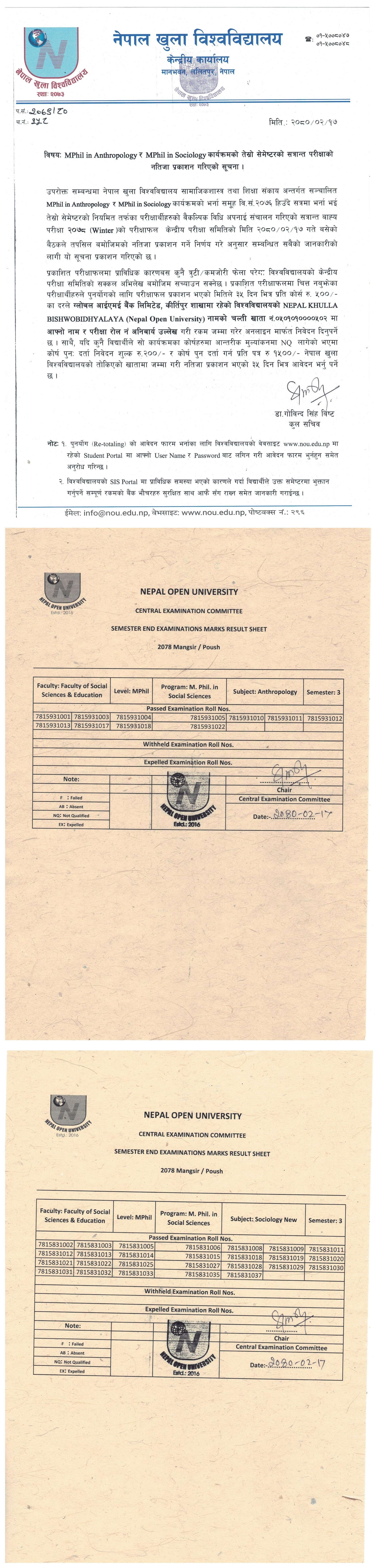 सामाजिकशास्त्र तथा शिक्षा संकाय अन्तर्गत सञ्चालित MPhil in Anthropology र MPhil in sociology कार्यक्रमको तेसो सेमेष्टरको परीक्षाफल प्रकाशन गरिएको सृ्चना